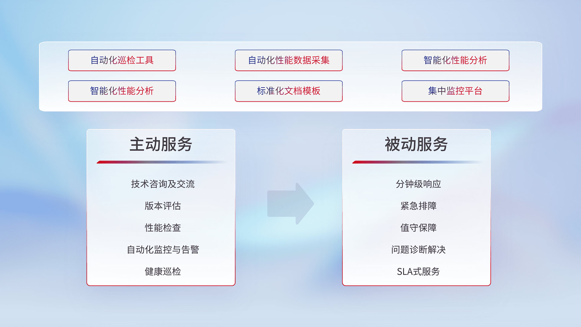智能化工具和标准化文档,,,保障服务质量,,提供主动服务(包含技术咨询、、、、版本评估、、、、性能检查、、自动化监控与告警、、、、健康巡检)和被动服务包含(分钟级响应、、紧急排障、、、、值守保障、、问题诊断解决、、、SLA服务)。。